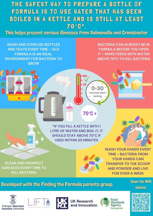 The safest way to prepare a bottle of formula is to use water that has been boiled in a kettle and is still at least 70°C. This helps prevent serious illnesses from Salmonella and Cronobacter.