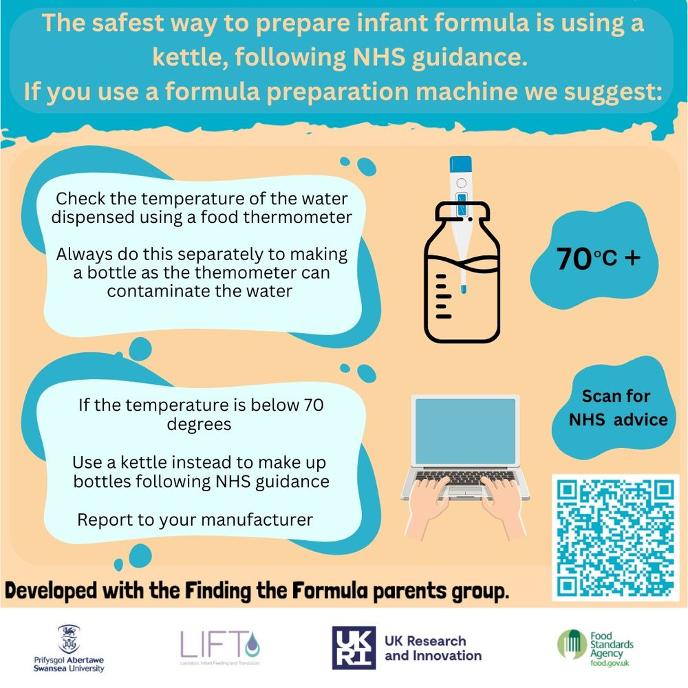 If you do have a formula preparation machine, check the temperature of the water dispensed using a food thermometer. Always do this separately to making a bottle, as the themometer can contaminate the water. If the temperature is below 70°C, use a kettle instead to make up bottles, and report to the manufacturer of the formula preparation machine.