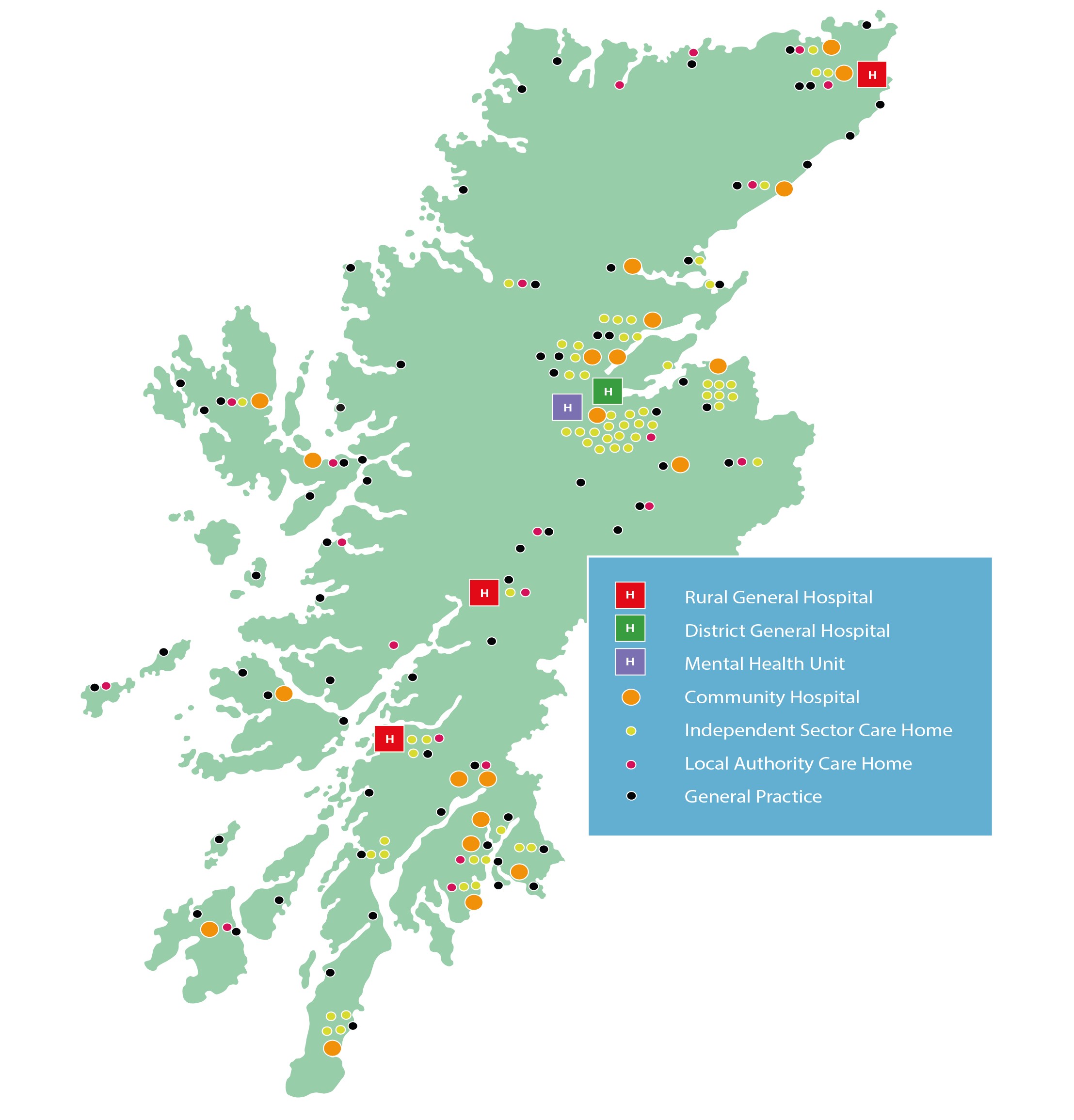 We provide services from 20 community hospitals, a learning disability unit, a specialist mental health hospital at New Craigs, and four rural general hospitals. Our major acute hospital - Raigmore Hospital - is in Inverness. Many of our services are delivered in partnership with primary care, social care and the voluntary sector.