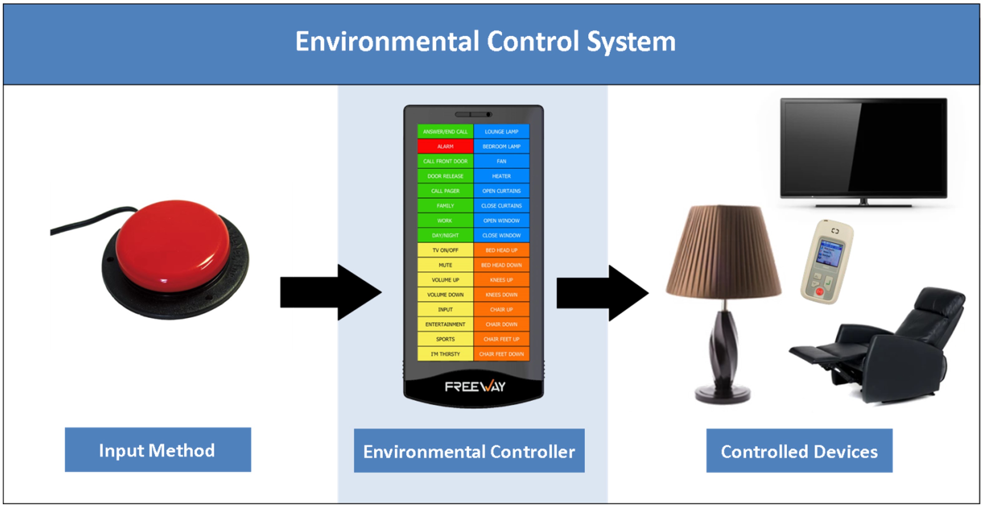 Environmental control systems are set up to allow the user to control their home devices using an accessible switch. Depending on the user's ability, this switch can be operated by their hand, foot, head, voice etc. The system can control home devices such as a telephone, mobile phone, pager or helpcall, TV (smart TV or satellite), music system, hospital-style bed, reclining static chair, lamps, fans or door opener.